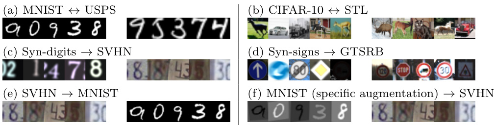 翻译和水平翻转的使用在我们的多项基准测试中产生了显著影响。为了在MNIST $\leftrightarrow$ USPS和SVHN $\rightarrow$ MNIST基准测试中超越现有技术,这一操作是必要的,同时也在CIFAR $10\leftrightarrow\mathrm{STL}$ 基准测试中提升了性能。仿射增强的使用可以提高涉及数字和交通标志识别数据集的实验性能,如表1中"MT $^+$ CT+TFA"行所示。相反,当用于摄影数据集时,它可能会损害性能,如STL $\rightarrow$ CIFAR-10实验所示。在VisDA-17实验(章节4.2)中,它同样降低了性能。