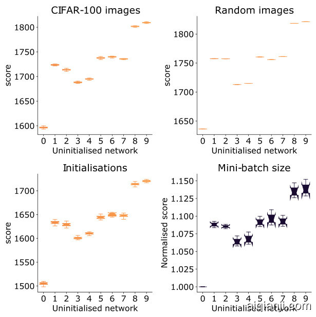 Figure 5. Ablation experiments showing the effect on our score using different CIFAR-100 mini-batches (top-left), random normallydistributed input images (top-right), weight initial is at ions (bottomleft), and mini-batch sizes (bottom-right) for 10 randomly selected NAS-Bench-201 architectures (one in each $5%$ percentile range from 50-55, ..., 95-100). For each network, 20 samples were taken for each ablation. The mini-batch size was 128 for all experiments apart from the bottom-right. The bottom-right experiment used mini-batch sizes of 32, 64, 128, and 256; as the score depends on the mini-batch size we normalised the score by the minimum score of the sampled networks from the same mini-batch size.
