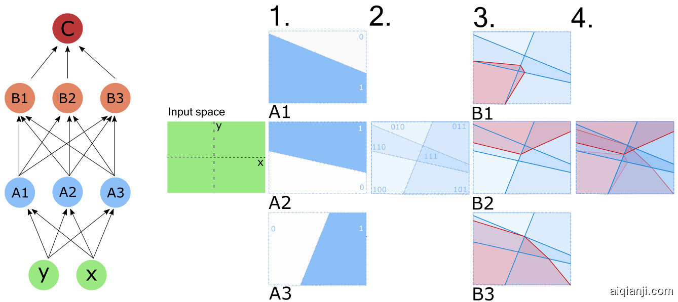 图 2: 可视化ReLU单元的二进制激活码如何对应线性区域。1: 每个ReLU节点$\mathbf{A}i$将输入划分为激活$(>0)$和非激活区域,我们用1标记激活区域,0标记非激活区域。2: 每个节点$\mathbf{A}i$相关的激活/非激活区域相交。具有相同激活模式的输入空间区域是共线的。这里我们展示了A节点的交集,并给出了线性区域的代码。代码的第$i$位对应于节点$\mathbf{A}i$是否激活。3: 下一层的ReLU节点B将空间进一步划分为激活和非激活区域。4: 给定节点的每个线性区域可以通过其之前所有ReLU节点的激活模式唯一定义。