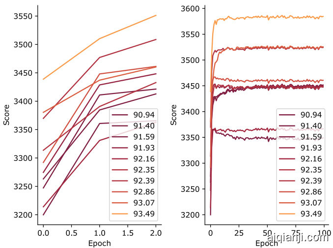 网络训练过程中评分如何变化?尽管我们工作的初衷是评估未经初始化的网络,但观察网络训练过程中评分的变化也很有价值。我们选取了10个在CIFAR-10数据集上验证准确率超过90%的NAS-Bench-201网络进行研究。这使得10个网络间的性能差异远小于整个搜索空间的差异。我们采用随机梯度下降法和交叉熵损失函数对每个网络进行100轮训练,并在每轮训练后评估其得分。图6展示了评分的变化趋势:左子图聚焦前两轮的评分轨迹,右子图则呈现全部100轮的评分轨迹。研究发现,所有网络在经过初步训练后评分均会立即上升,但很快会稳定在接近恒定的数值。各网络在初始化后的评分增幅相似,且相对排名在整个训练过程中保持稳定。