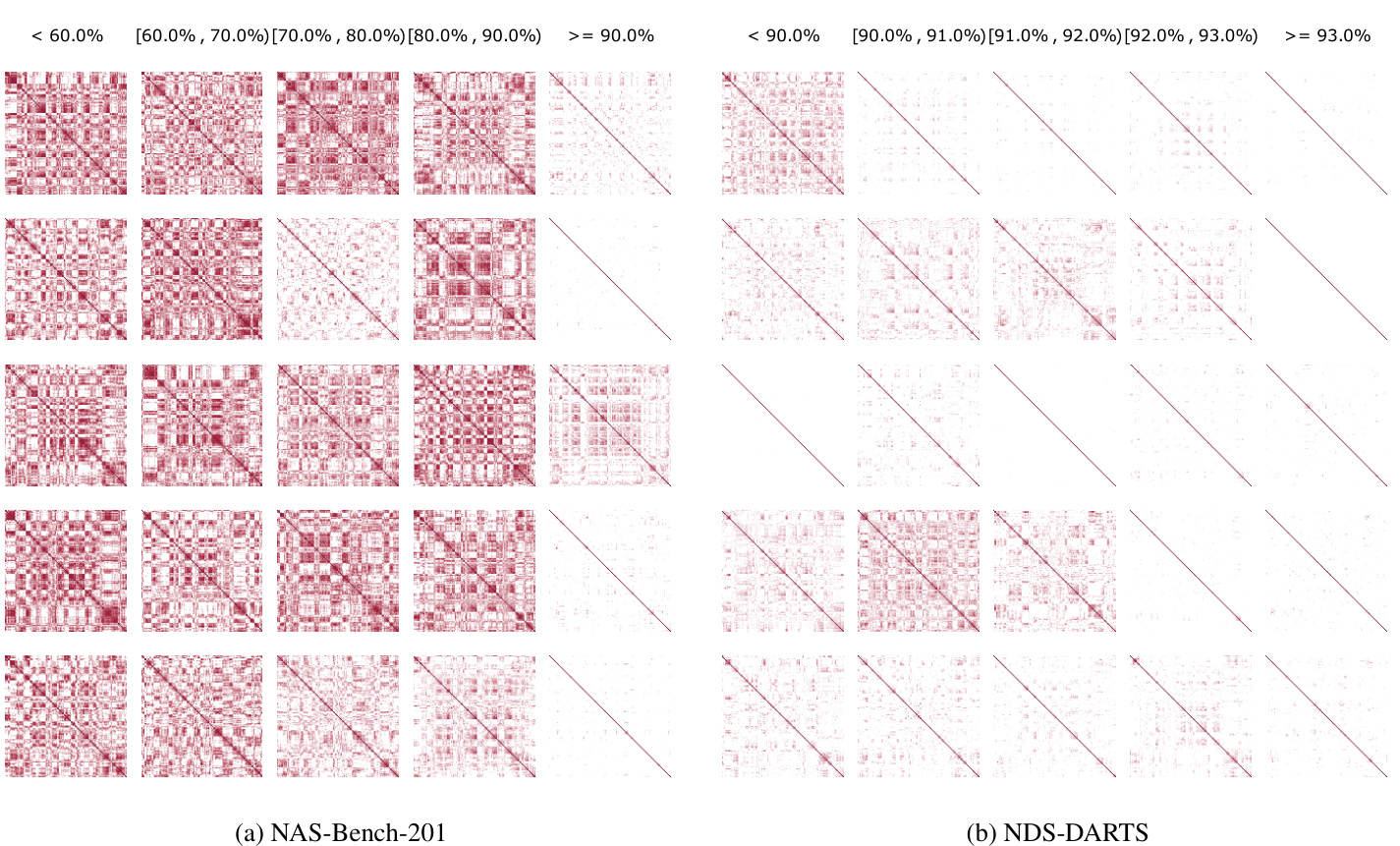 Figure 1. ${\bf K}_ {H}$ for a mini-batch of 128 CIFAR-10 images for untrained architectures in (a) NAS-Bench-201 (Dong & Yang, 2020) and (b) NDS-DARTS (Ra dosa vo vic et al., 2019). ${\bf K}_ {H}$ in these plots is normalised so that the diagonal entries are 1. The ${\bf K}_ {H}$ are sorted into columns based on the final CIFAR-10 validation accuracy when trained. Darker regions have higher similarity. The profiles are distinctive; the ${\bf K}_ {H}$ for good architectures in both search spaces have less similarity between different images. We can use ${\bf K}_ {H}$ for an untrained network to predict its final performance without any training. Note that (b) covers a tighter accuracy range than (a), which may explain it being less distinctive.