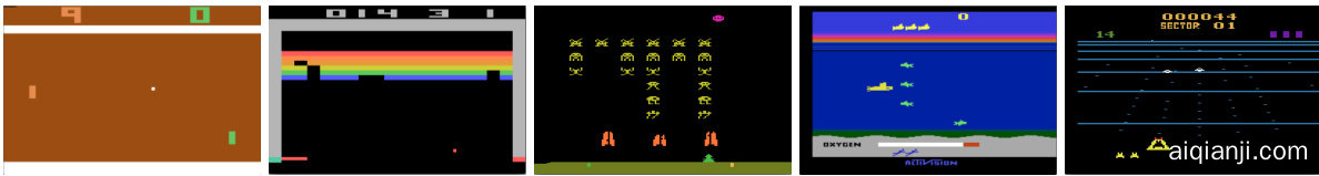 图 1: 五款Atari 2600游戏画面截图:(从左至右) Pong, Breakout, Space Invaders, Seaquest, Beam Rider