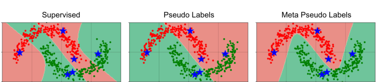 Results. We randomly generate the TwoMoon dataset for a few times and repeat the three methods: Supervised Learning, Pseudo Labels, and Meta Pseudo Labels. We observe that Meta Pseudo Labels has a much higher success rate of finding the correct classifier than Supervised Learning and Pseudo Labels. Figure 2 presents a typical outcome of our experiment, where the red and green regions correspond to the class if i ers’ decisions. As can be seen from the figure, Supervised Learning finds a bad classifier which classifies the labeled instances correctly but fails to take advantage of the clustering assumption to separate the two “moons”. Pseudo Labels uses the bad classifier from Supervised Learning and hence receives incorrect pseudo labels on the unlabeled data. As a result, Pseudo Labels finds a classifier that mis classifies half of the data, including a few labeled instances. Meta Pseudo Labels, on the other hand, uses the feedback from the student model’s loss on the labeled instances to adjust the teacher to generate better pseudo labels. As a result, Meta Pseudo Labels finds a good classifier for this dataset. In other words, Meta Pseudo Labels can address the problem of confirmation bias [2] of Pseudo Labels in this experiment.