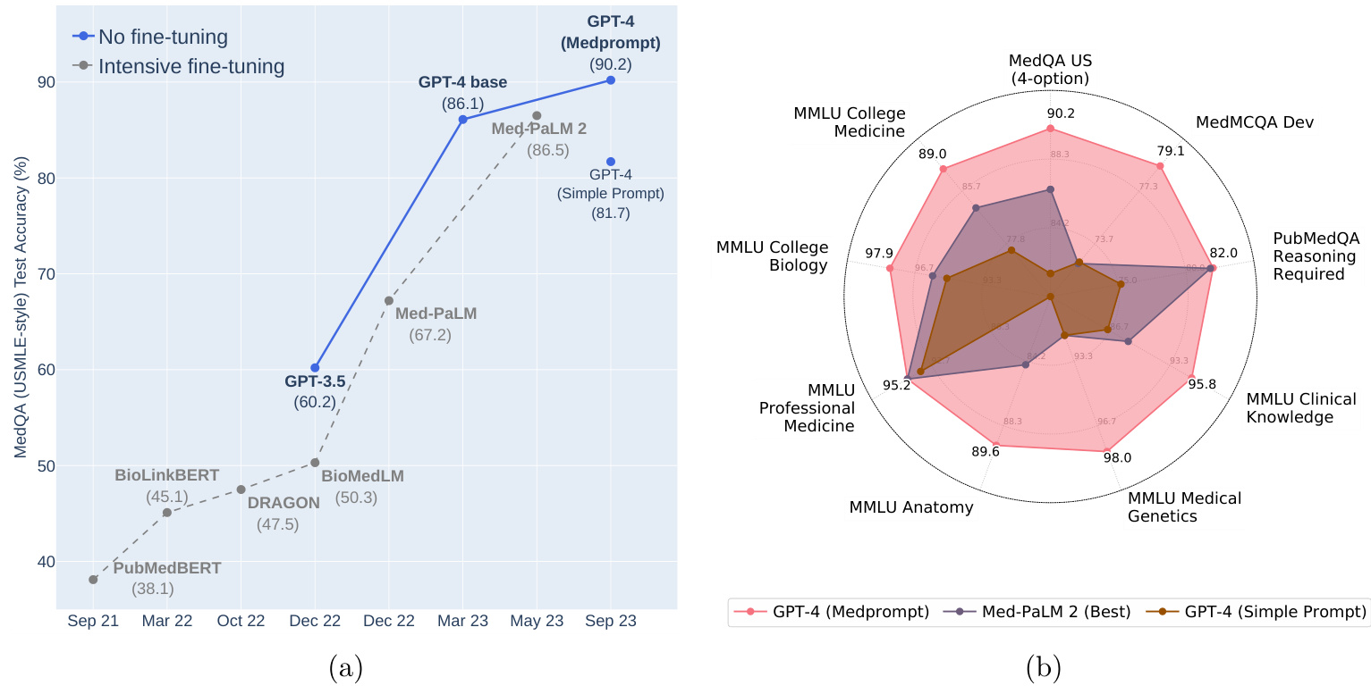 Figure 1: (a) Comparison of performance on MedQA. (b) GPT-4 with Medprompt achieves SoTA on a wide range of medical challenge questions.