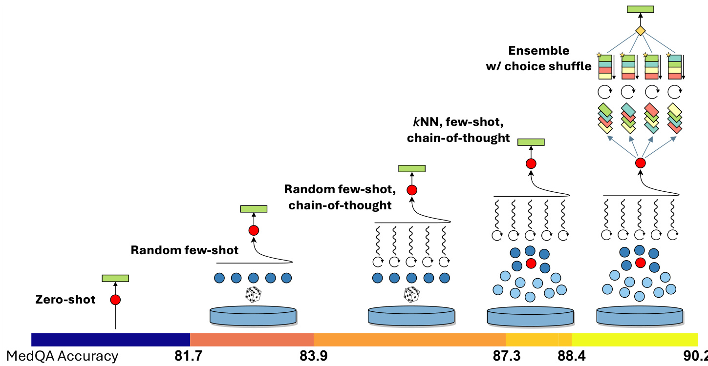 上下文学习 (In-Context Learning, ICL) 是基础模型的关键能力,使模型仅需少量任务演示即可解决新任务 [3]。例如,通过在测试问题前添加若干不同的问题示例及期望结果,即可构建ICL提示。该方法无需更新模型参数,却能获得类似微调的效果。少样本提示中所选示例会显著影响模型性能。在我们先前关于GPT-4在医学挑战问题表现的研究 [23] 中,特意将提示限制在基础上下文学习方法(如固定单样本和五样本提示),以证明GPT-4可被轻松引导至卓越表现。