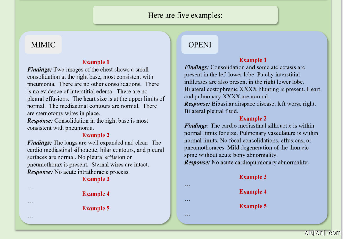 本节将讨论我们针对大语言模型(LLM)的测试方法。首先介绍用于评估的数据集MIMIC和OpenI。我们的测试方法采用固定提示集和参数设置,评估大语言模型在放射学领域的表现,特别关注其根据检查结果生成印象报告的性能。为确保一致性,我们设定了大语言模型的若干超参数:温度(temperature)设为0.9,top_ k设为40,top_ p设为0.9。为评估模型的零样本(zero-shot)和少样本(few-shot)性能,我们分别采用零样本、单样本和五样本示例作为提示。实验结果及其详细分析将在结果部分呈现。