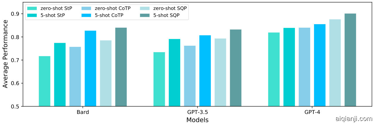 图 3: 零样本和5样本学习设置下,三种提示方法在Bard、GPT-3.5和GPT-4模型中的平均性能对比。性能值为所有数据集的平均值,假设数据集和评估指标具有同等重要性且可直接比较。自我提问提示方法始终优于标准提示和思维链提示,而GPT-4在模型中表现最优。