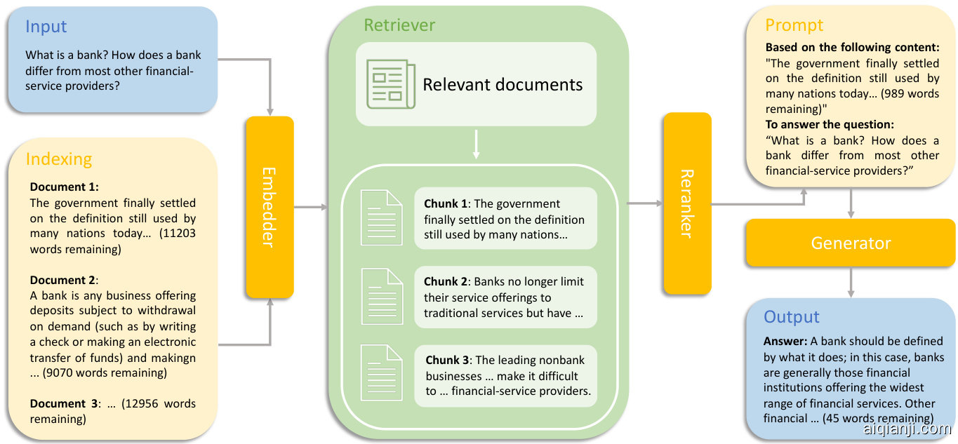 图 2: 我们提出的基于RAG的LFQA系统工作流程。Embedder负责将文档和用户问题编码为语义向量。Retriever根据编码后的问题检索相关文档片段。Reranker剔除相似度较低的片段。通过将问题和片段组合成提示(prompt),生成器最终输出所需答案。