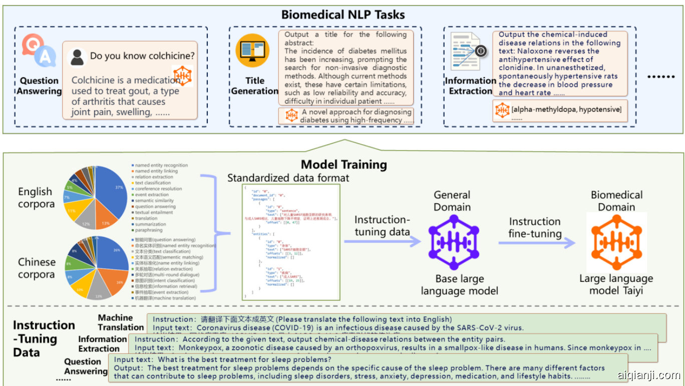 目标:现有大多数经过微调的生物医学大语言模型主要关注提升单语种生物医学问答和对话任务的性能。为探究微调后大语言模型在不同语言的多样化生物医学自然语言处理任务中的有效性,我们提出了双语生物医学任务微调模型Taiyi。