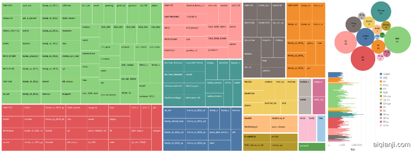 图 2: 数据集收集概览。在矩形树图(左)中,整个图形由一个大矩形表示,代表收集的140个双语开源数据集。这个大矩形被划分为多个不同颜色的小矩形,每个小矩形代表特定的BioNLP任务,并列出了与该任务相关的所有数据集名称。散点图(右上)中每个数据点代表一个BioNLP任务,其大小由该任务关联的数据集数量决定。条形图(右下)展示了不同任务相关数据集的规模,进一步呈现了每个任务的数据集数量。