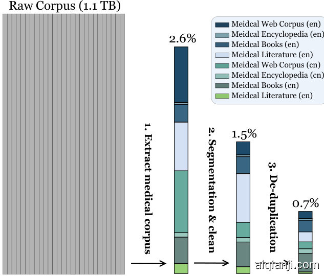 领域语料库对于增强特定领域的专业知识至关重要。我们收集了1.1TB的中英文语料,来源包括百科全书、书籍、文献和网络语料,融合了C4等通用语料和PubMed等专业语料。所有语料均公开可获取,详见附录C。随后,我们建立了一套精细的收集流程以筛选高质量领域数据(附录C详述),最终获得5,252,894份优质医学文档用于预训练语料库。