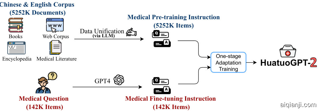 接下来,我们将详细介绍如何针对中国医疗行业进行适配,并开发HuatuoGPT-II。