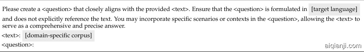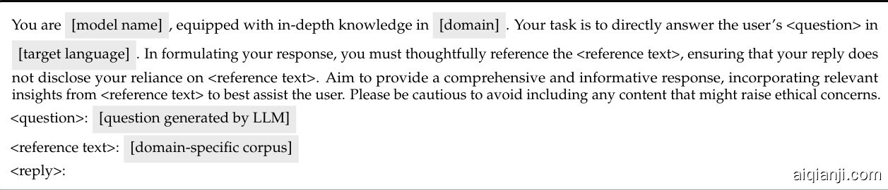 图 2: 问题生成的提示语。[target language] 是中文,[domain-specific corpus] 指领域专用预训练语料库中的语料。