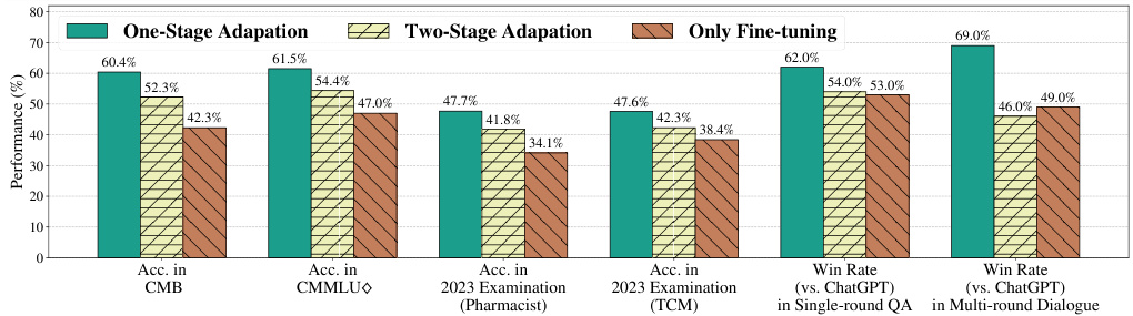 Verification for the new protocol To verify the one-stage protocol, we experiment on Chinese healthcare 2 where ChatGPT and GPT-4 perform relatively poorly (Wang et al., 2023a). Leveraging the proposed protocol, we train a Chinese medical language model, HuatuoGPT-II. Inspired by back-translation (Li et al., 2023d), we employ the prowess of LLMs for data unification, where all diverse and multilingual pre-training data are converted to Chinese instructions with a consistent style. This stage bridges the gap between two-stage data, especially for training LLMs in unpopular languages, where English data is overwhelmingly more abundant and high-quality. Subsequently, a priority sampling strategy is used to integrate pre-training and SFT instructions for domain adaption. We believe this unified domain adaptation protocol can be similarly effective in other specialized areas such as finance and law, as well as in different languages.