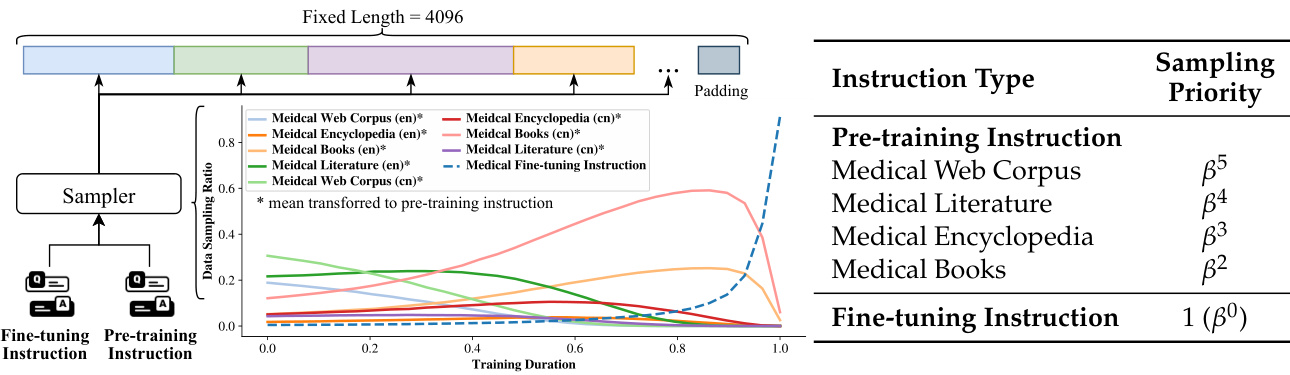Figure 4: One-stage training process and sampling priority. The diagram (left) illustrates the onestage training methodology. The table (right) details the sampling priority for various instructional data types, with the $\beta$ (set as 2) dictating the relative priority. Higher $\beta$ values indicate a more sequential sampling approach, whereas lower values suggest a blended strategy.