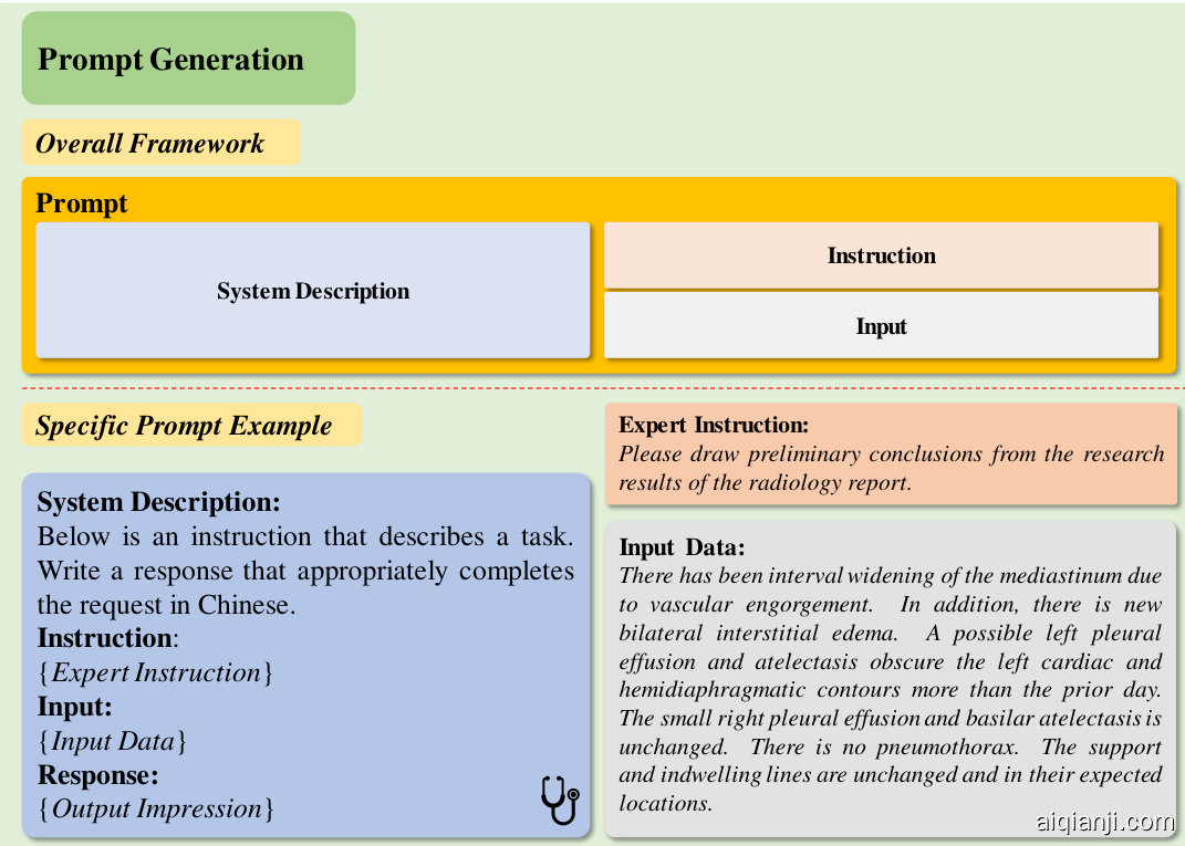As one of the most influential artificial intelligence (AI) products today [26], LLMs, known as generative models, provide a user-friendly human-machine interaction platform that brings the powerful capabilities of large language models to the public and has been rapidly integrated into various fields of application [26–42]. Liu et al. [41] proposed Radiology-GPT, which uses instruction tuning approach to fine-tune Alpaca [43] for mining radiology domain knowledge, and prove its superior performance on reports sum mari z ation task. Based on Llama2, Liu et al. [42] further presented Radiology-Llama2 using instruction tuning to fine-tune Llama2 on radiology reports. However, they both ignore the fact that the style and norm at iv it y of radiology reports vary among individuals and institutions with writing habits and education. Therefore, they are difficult to achieve satisfactory results when training medical LLMs.
