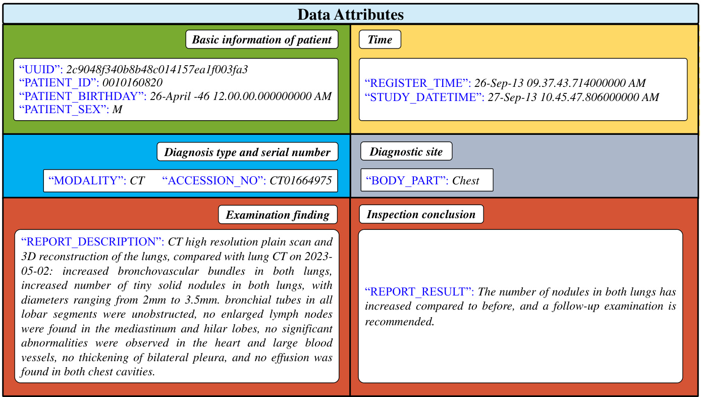 在这项多机构建模研究中,我们从六家机构的报告系统中检索并下载了包含基本信息、描述和印象的放射学报告。具体而言,图2展示了一份放射学报告示例的具体数据属性,表1则呈现了全面的数据分布情况。