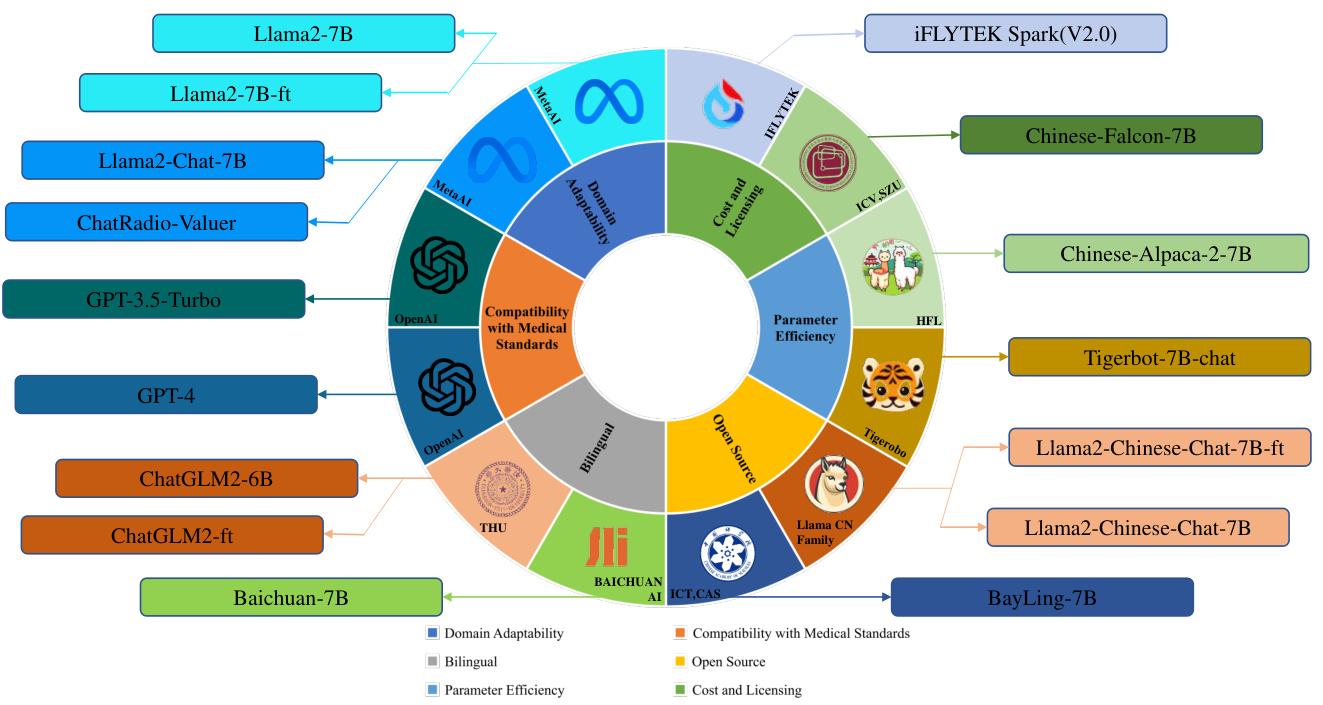 Before the training stage, we investigate the well-known LLMs from medical perspective and constructed LLM pool for model selection. We mainly focus on 6 aspects, indicated in Figure 5, domain adaptability, compatibility with medical standards, bilingual, open source, parameter efficiency, and cost and licensing. A brief introduction to these metrics is listed below: