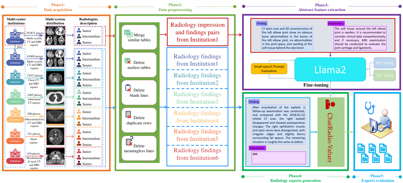 Figure 1: Overall framework of the proposed method for radiology report generation. Multiinstitution and multi-system clinical radiology reports are acquired in phase 1. Systematic data preprocessing is implemented and then synthesizes the samples into high-quality prompts in phase 2. The general iz able advanced features are extracted and applied for clinical utilities in phase $3&$ phase 4. The comprehensive evaluations on ChatRadio-Valuer’s efficacy are executed in phase 5.