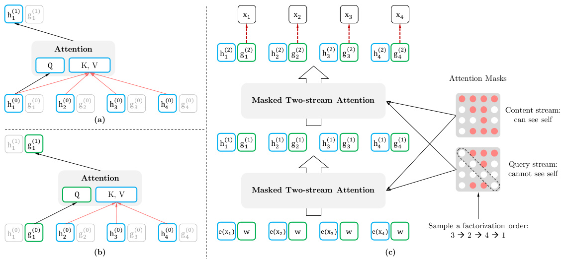 Computationally, the first layer query stream is initialized with a trainable vector, i.e. $g_{i}^{(0)}=w$ , while the content stream is set to the corresponding word embedding, i.e. $h_{i}^{(0)}=e(x_{i})$ . For each self-attention layer $m=1,\ldots,M$ , the two streams of representations are schematically 2 updated with a shared set of parameters as follows (illustrated in Figures 1 (a) and (b)):