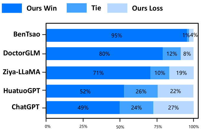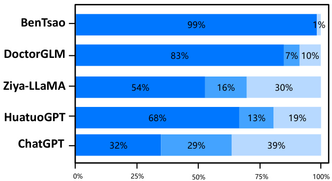 • 我们在两个基准测试数据集上进行了多项实验。我们的模型在所有维度上都超越了此前表现最优的中文医疗模型,并在特定领域与ChatGPT持平。