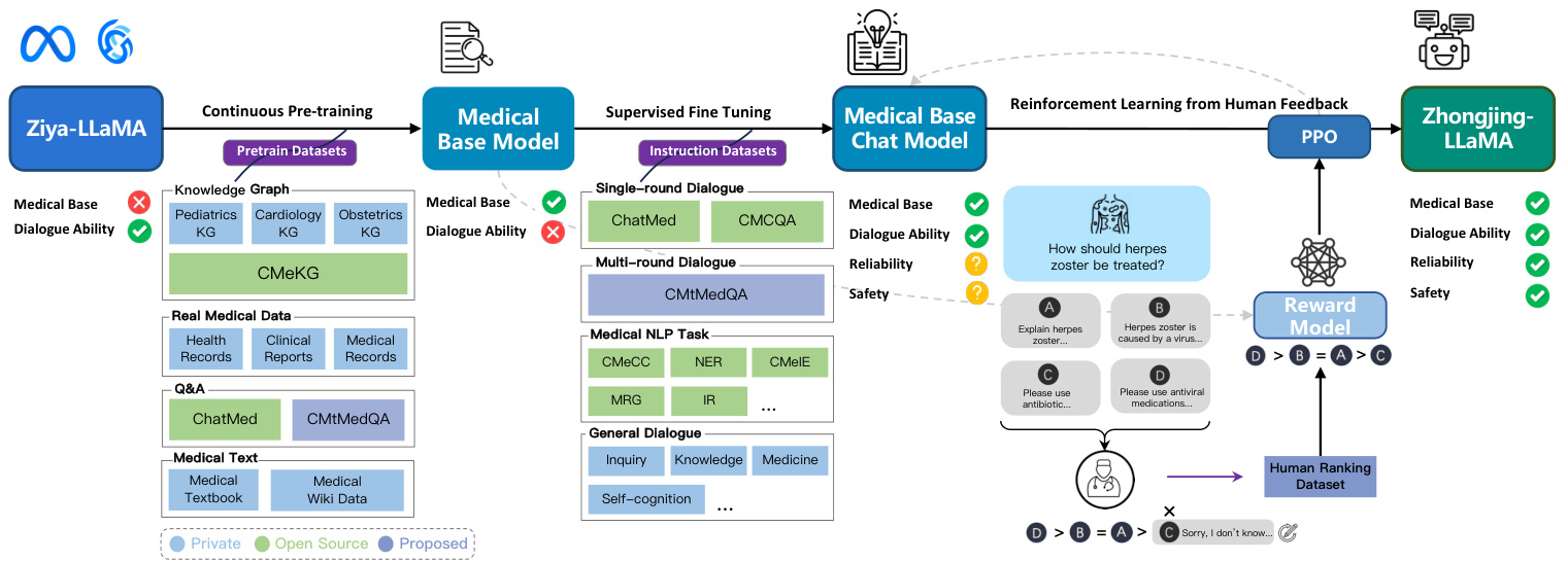 • 我们开发了一款新型中文医疗大语言模型 (Large Language Model) 张仲景 (Zhongjing),这是首个实现从预训练、监督微调 (SFT) 到强化学习人类反馈 (RLHF) 全流程训练的模型。