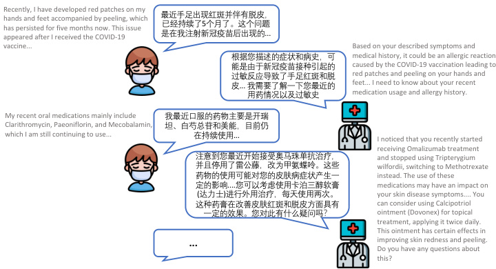 图 1: 多轮中文医疗咨询对话示例,高度依赖大语言模型 (LLM) 的主动询问能力。