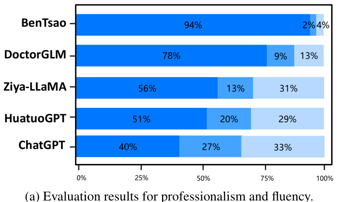 Benchmark Test Datasets We conduct experiments on the CMtMedQA and huatuo-26M (Zhang et al. 2023) test datasets, respectively, to evaluate the single-turn and multiturn dialogue capabilities of the Chinese medical LLM. When building CMtMedQA, we set aside an additional 1000 (a) Evaluation results for professionalism and fluency.