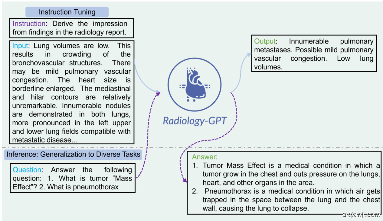 通过这种方法论,Radiology-GPT旨在捕捉解读放射学报告所需的特定语言模式、术语和逻辑推理能力,从而成为辅助放射科医师的高效可靠工具。