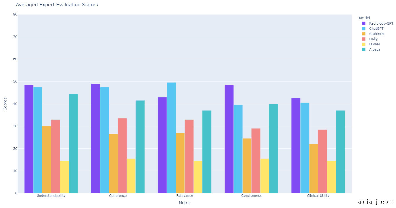在医疗领域,尤其是放射学中使用大语言模型(LLM)的一个挑战在于确定其有效性和可靠性。鉴于错误的后果,采用适当方法来评估和比较其输出至关重要。为定量评估Radiology-GPT及其他语言模型在放射学中的表现,我们实施了衡量生成回答的可理解性、连贯性、相关性、简洁性和临床实用性的策略。