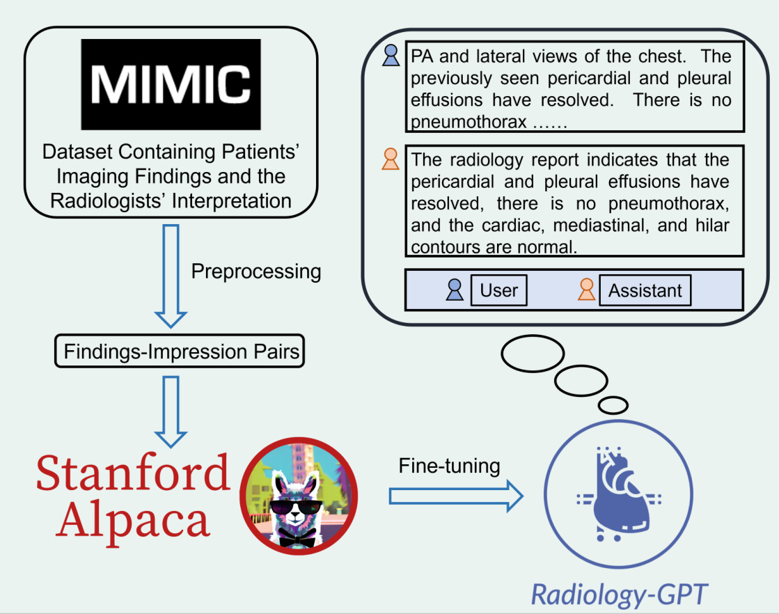 Our approach to building Radiology-GPT involves a two-step process: preprocessing of the dataset and fine-tuning the model with instruction following. The pipeline of our method can be seen in Figure 1.