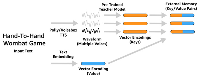 Fig. 3: Overview of our text-catalog encoding process. For each catalog entry, we generate TTS-based audio encoding that forms the “key” vector in the key-value pair. The value is a semantic text-embedding of the entry. Key/value pairs are assembled into the external memory, referenced in Figure 2