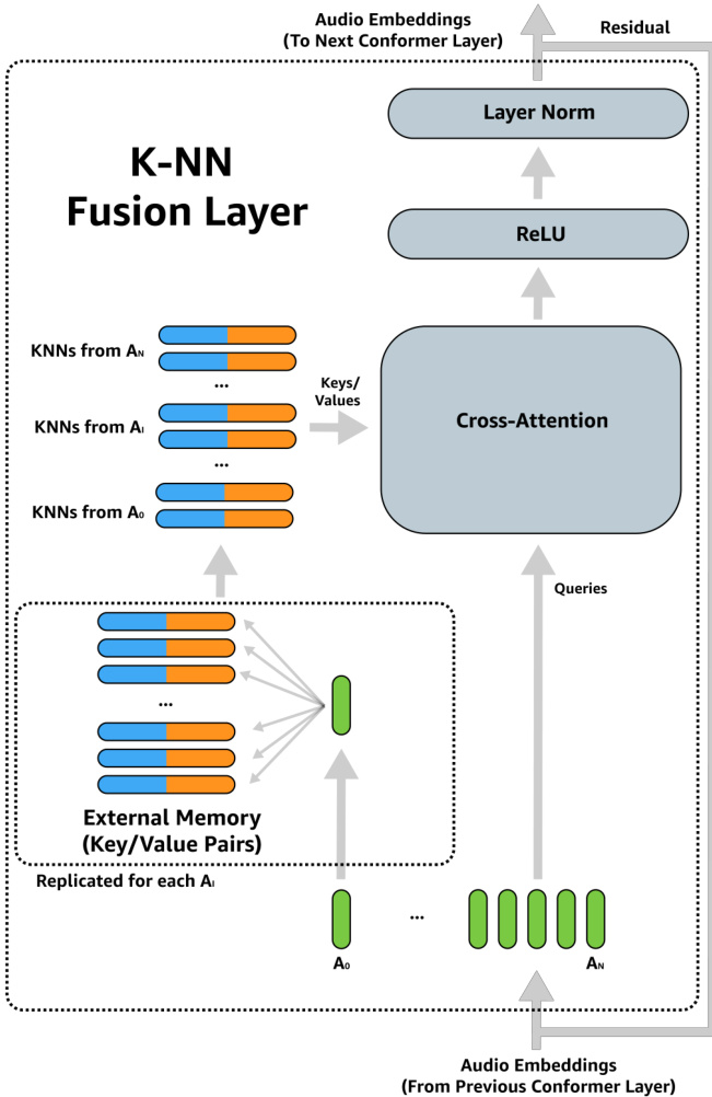 An overview of the external memory fusion process is given in Figure 2. The speech encoder in our proposed work is based on the Conformer encoder [36], augmented with additional KNearest-Neighbor (KNN) fusion layers. In each KNN fusion layer, for each audio frame embedding $a_{i}$ of the utterance $A$ , we query the external memory $E=(k_{i},v_{i}),1\leq i\leq|E|$ for a set of $m$ nearest neighbors: