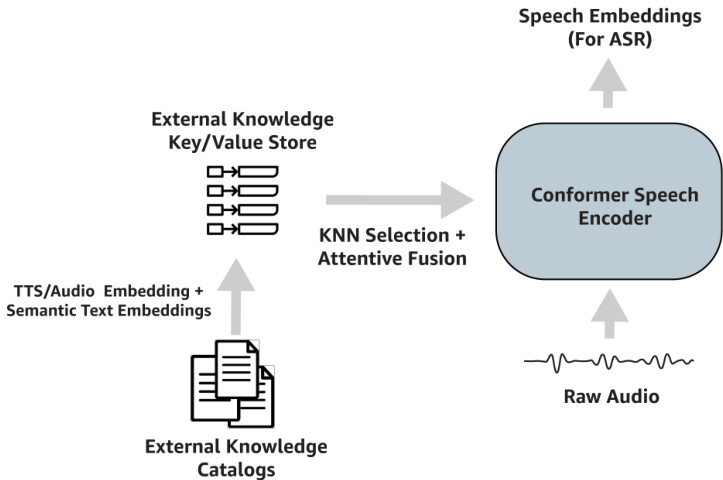 在本工作中,我们提出了一种利用外部文本数据目录(包含多达1000万个专业词汇或短语的大型列表)的方法,以提升模型在微调过程及将已微调模型适配到新数据集时的性能。我们方法的核心亮点包括:首先,我们构建了一个键值外部知识库,将目录中每个文本元素(通常包含100万至1000万样本)的音频表征映射到其语义表征。接着,我们训练了一个模型,通过关注检索到的键值对来利用这个外部知识库,这些键值对通过近似 $\mathbf{k}$ 近邻算法检索得到。依赖一个外部、恒定且离线的键值存储意味着该存储可以在适配过程中更新,仅需为每个新模型提供更新的短语列表,而无需额外微调。