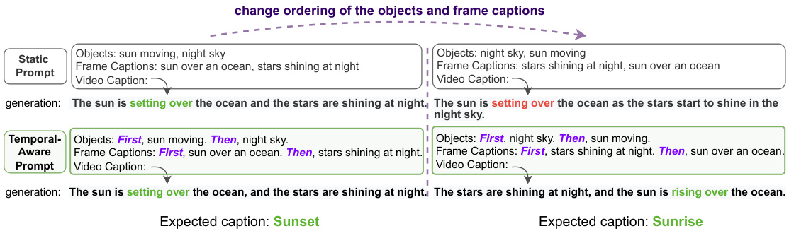 Figure 3: Temporal-aware prompt successfully distinguishes the Sunset and Sunrise scenarios based on the temporal ordering change of objects and frame captions, while the static prompt fails.