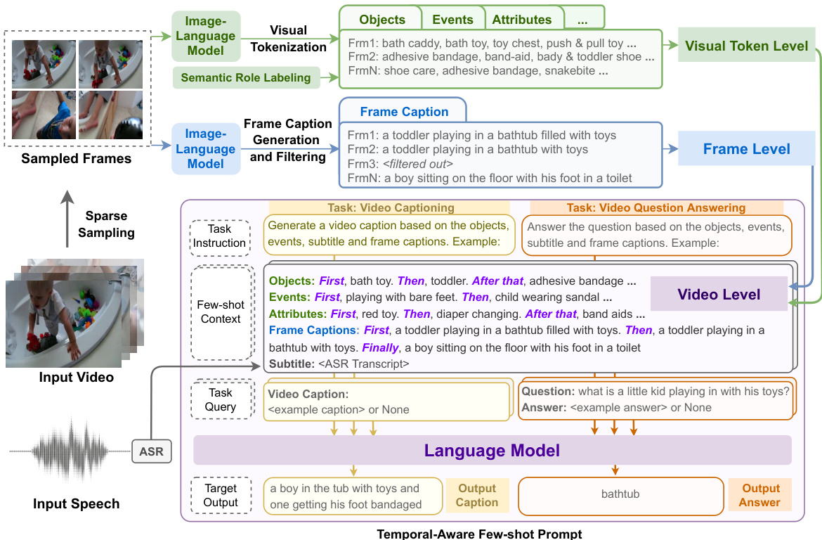 To address the unique challenges of videos, we propose to decompose a video into three levels: the video output, frame captions, and visual tokens (including objects, events, attributes). One major benefit from this hierarchical video representation is that we can separate the visual and temporal dimensions of a video. We leverage frozen image-language foundational models at lower levels to collect salient visual features from the sparsely sampled frames. Specifically, we first leverage a pretrained image-language contrastive model CLIP [44] to perform visual token iz ation, based on the similarity score between frames and tokens of objects, events and attributes. The token iz ation is done under the guidance of semantics role labeling [14], which provides us with candidate events with involved objects and related attributes. Next, in order to capture the overall semantics at the frame level, we employ the pretrained image captioner in the image-language model BLIP [26] to obtain frame captions. Finally, we instruct a pretrained large language model using in-context learning [40, 13, 51, 48] to interpret visual tokens and frame captions into the target textual output. In detail, we temporally order visual tokens and frame captions using specially designed prompts such as “First...Then...Finally”, to instruct the pretrained language model to track the changes of objects, events, attributes and frame semantics along the temporal dimension.
