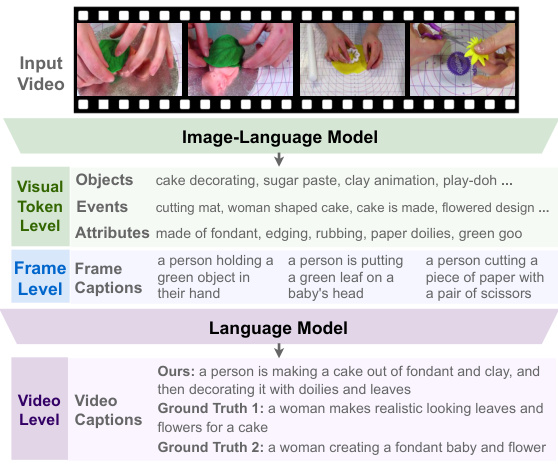 理解视频的主要挑战在于,视频在多个粒度层级上包含丰富的语义和时序内容。与静态图像仅捕捉某一时刻的物体、属性和事件不同,视频的时间维度进一步传递了物体状态、动作和事件的变化。例如在图1中,视频片段的单帧描述仅呈现了"一个人手里拿着绿色物体"等静态视觉特征。而正确的视频级描述应为"一位女性为蛋糕制作逼真的树叶和花朵装饰",这需要推理视频片段中不同时间点发生的物体和事件集合,例如"蛋糕装饰"和"花卉设计"。因此,要为视频级描述和查询提供依据,我们必须表征所有这些信息及其时序关系。