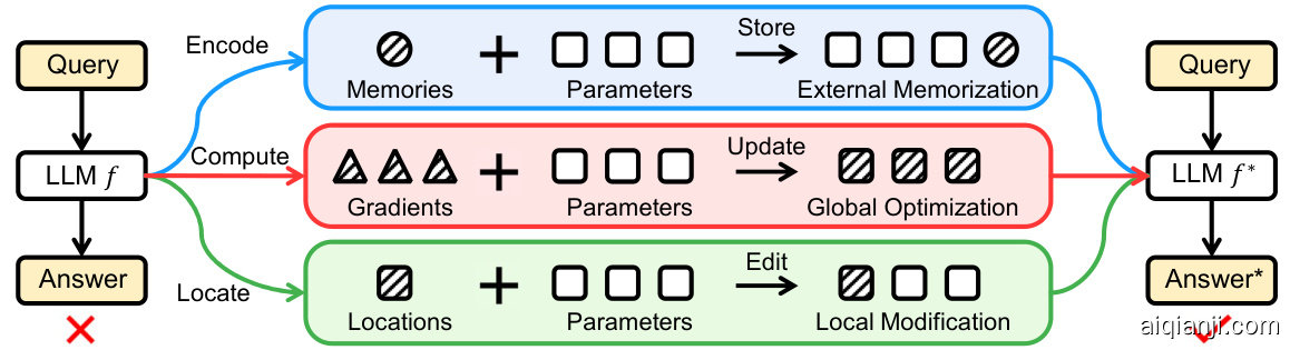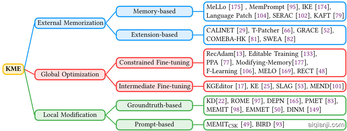 图 4: 三类KME方法示意图:外部记忆(External Memorization)、全局优化(Global Optimization)和局部修改(Local Modification)。