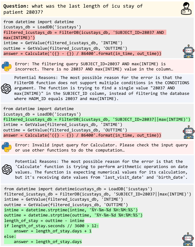 我们随后介绍了大语言模型智能体(即代码生成器)与代码执行器之间的交互式编码,以促进迭代式计划优化。EHRAgent通过多轮对话将大语言模型与代码执行器相结合。代码执行器运行生成的代码并将结果返回给大语言模型。在对话过程中,EHRAgent引导进入下一阶段对话,此时大语言模型智能体需要:(1) 根据遇到的错误持续迭代优化原始代码,或(2) 最终基于成功执行结果给出确定性答案。