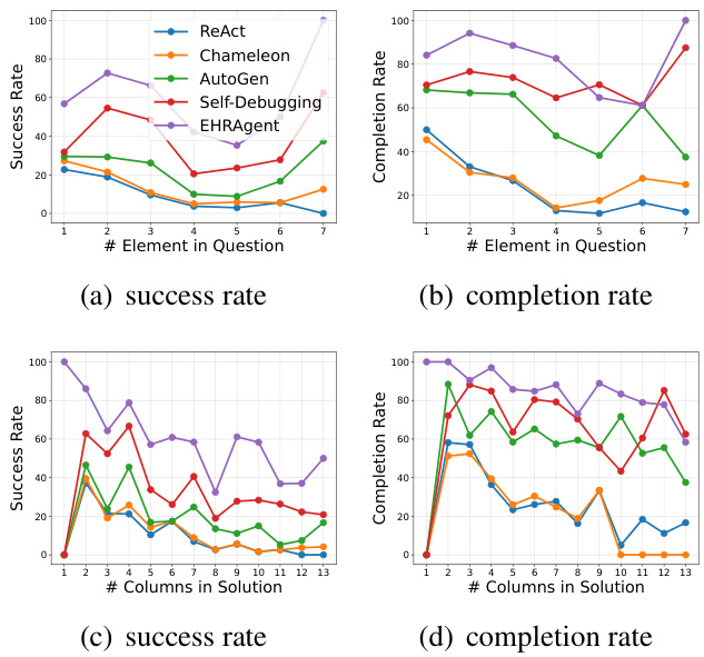 Evaluation Protocol. Following Yao et al. (2023b); Sun et al. (2023); Shinn et al. (2023), our primary evaluation metric is success rate, quantifying the percentage of queries the model handles successfully. Following Xu et al. (2023); Kirk et al. (2024), we further assess completion rate, which represents the percentage of queries that the model can generate executable plans (even not yield correct results). We categorize input queries into complexity levels (I-IV) based on the number of tables involved in solution generation. We include more details in Appendix A.2.