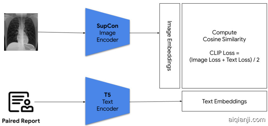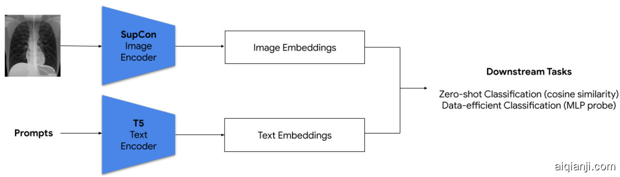 - ELIXR 使用配对的胸部X光片 (CXR) 和自由文本放射学报告进行训练 - 这些数据在医疗保健领域无处不在。该训练过程无需专家进行昂贵的手动标注。这种方法释放了常规收集的医疗数据的价值,使开发AI系统的规模远超以往,同时大幅降低总体成本。