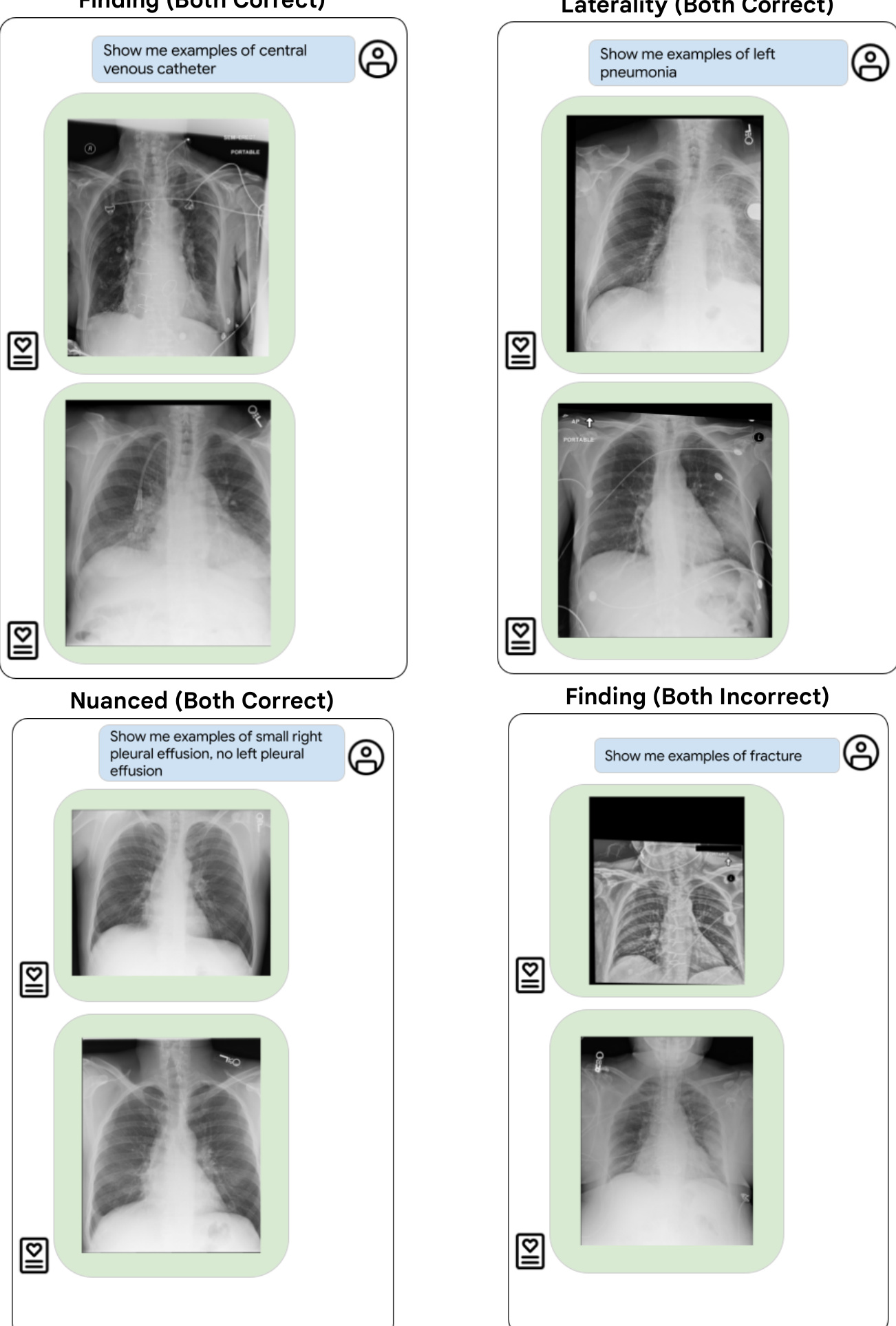 Semantic search unlocks the ability to search within an image for features of interest using free text prompts. ELIXR demonstrated high retrieval precision across a broad range of queries, including perfect retrieval of five out of seven findings-related queries (e.g. “central venous catheter”), two out of three laterality-specific queries (e.g. “right pleural effusion”), two out of four severity-related queries (e.g. “moderate card iomega ly”), and three out of five nuanced queries (e.g. “na so gastric tube reaches stomach”). This capability could be used by researchers to identify images for study datasets, by clinicians to search for specific images of interest from a patient’s historical record, by educators to find examples for teaching purposes, as well as in many other applications.