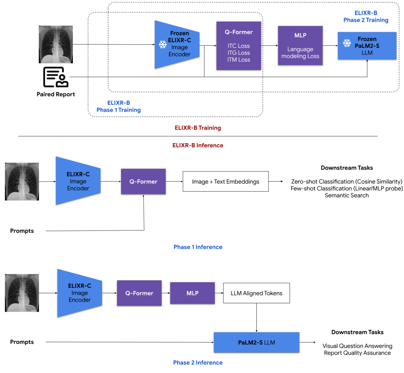 Second, we trained an LLM-aligned adapter network ELIXR-B (Figure 1b), based on the Boots trapping Language-Image Pre-training 2 (BLIP-2) architecture 10. ELIXR-B is built directly upon ELIXR-C, where it aims to extract location-aware features from the unpooled spatial ELIXR-C image embedding space and map them to the LLM’s language token space. In this work, we used PaLM 2-S as the LLM14. By serving as an adapter between the image encoder and the LLM, ELIXR-B passes information between vision and language encoders via an attention mechanism, and allows us to leverage the existing knowledge and reasoning abilities of the LLM to interpret the images and perform various vision-language tasks (e.g. captioning, VQA). For computation and data efficiency, we keep both ELIXR-C and PaLM 2-S frozen, and only train the adapter between them. This can be thought of as a way of grafting an image encoder onto an LLM. More specifically, following the BLIP-2 architecture 10, there are two phases to ELIXR-B training: vision-language representation learning (phase 1) and vision-language generative learning (phase 2). In the first phase, the vision-language model (the Q-Former) is trained to understand and represent both CXRs and reports in a shared embedding space by jointly employing three different tasks: a) image-text contrastive learning (ITC), b) image-grounded text generation (ITG), and c) image-text matching (ITM). Standard contrastive loss is applied for image-text contrastive learning; image-grounded text generation is modeled as a classification problem (i.e. which token in the vocabulary should be chosen at each output position) and optimized by cross-entropy loss; image-text matching is modeled as a binary classification problem (image-text matched/unmatched) and optimized by cross-entropy loss. This results in a model that can extract key information from the image embeddings and align it with the report text embedding space. In the second phase, a multilayer perceptron (MLP) that connects the $\mathsf{Q}$ -Former with the LLM, and the $\mathsf{Q}$ -Former itself are further trained to generate the impressions section of radiology reports based upon the image embeddings from ELIXR-B using the LLM. The language modeling (standard cross-entropy) loss is used to guide the training. The result is that the $\mathsf{Q}$ -Former is able to produce LLM-aligned tokens based on the image and feed the most useful information to the LLM, while removing irrelevant visual information.