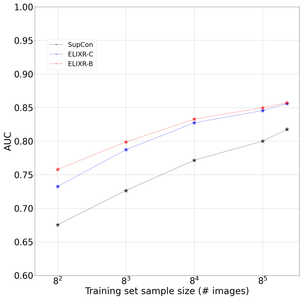The ELIXR architecture is data and computationally efficient. Previously we demonstrated that small nonlinear class if i ers trained on a frozen SupCon vision encoder can outperform fully supervised models in low-data settings12. With ELIXR, we have improved upon the data efficiency of supervised contrastive learning by two orders of magnitude. This offers the potential to train highly accurate models that are capable of addressing the long tail of diagnoses (including rare diseases), with only a fraction of the requirement for expert-curated training data. The process of prototyping a model for a new task also becomes simplified and more widely accessible, requiring only the design of positive and negative prompts using natural language without a requirement for machine learning expertise. We hope that these approaches will enable a wider range of researchers to engage in a broader array of diagnostic research questions and will allow medical professionals to develop models for under served populations or understudied diseases.