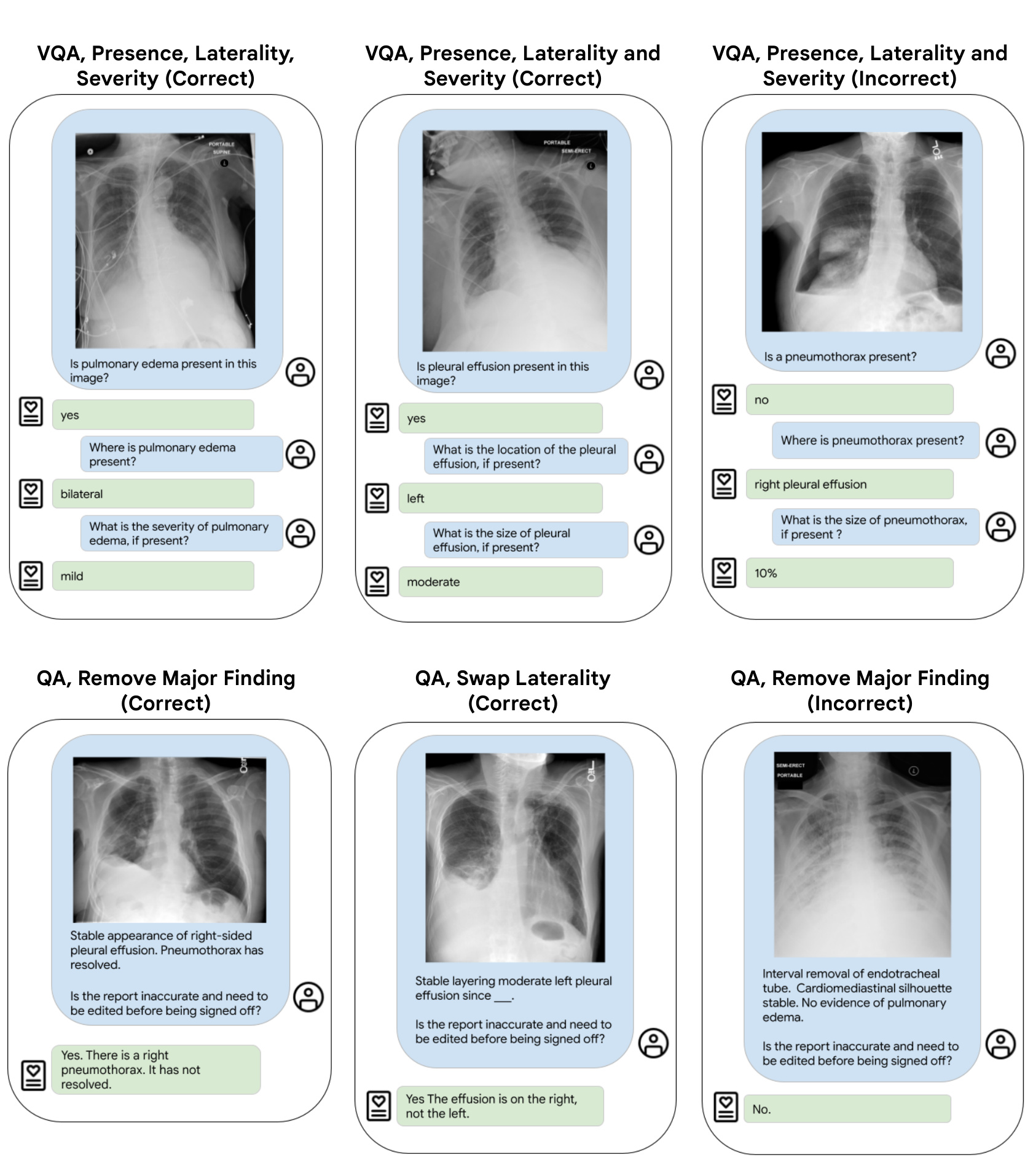 Finally, we demonstrate the ability of ELIXR to use its understanding of CXRs to check for errors in written radiology reports. We envision that such a capability could have utility in the hospital setting, potentially acting as an advanced multimodal “spell check” to alert radiologists to suspected inconsistencies in their reports, improving both quality and consistency of care. It could also act as an “AI Mentor”, evaluating and mentoring more junior radiologists, including in settings where resource limitations result in less opportunity for oversight by senior radiologists. VQA and QA were heavily dependent on the specific prompts used, which were in turn affected by the LLM used by ELIXR. With further work into prompt engineering, it is expected that one could make the QA more specific, with fewer false positive reports. This high specificity is likely to be needed in a clinical environment, especially where the error rate is far lower than in this enriched simulated set.