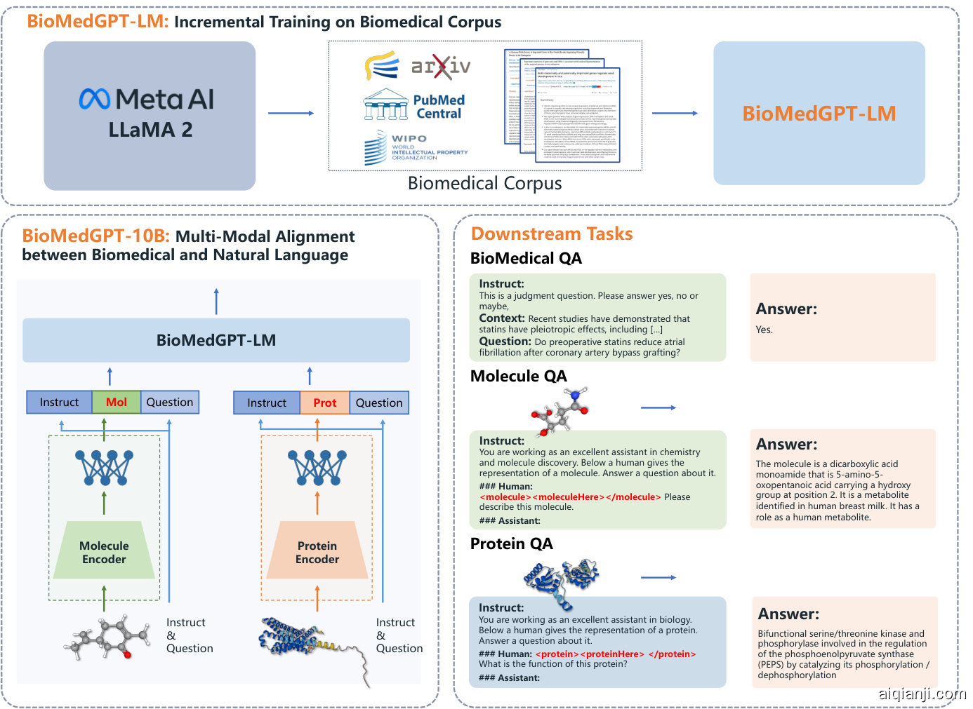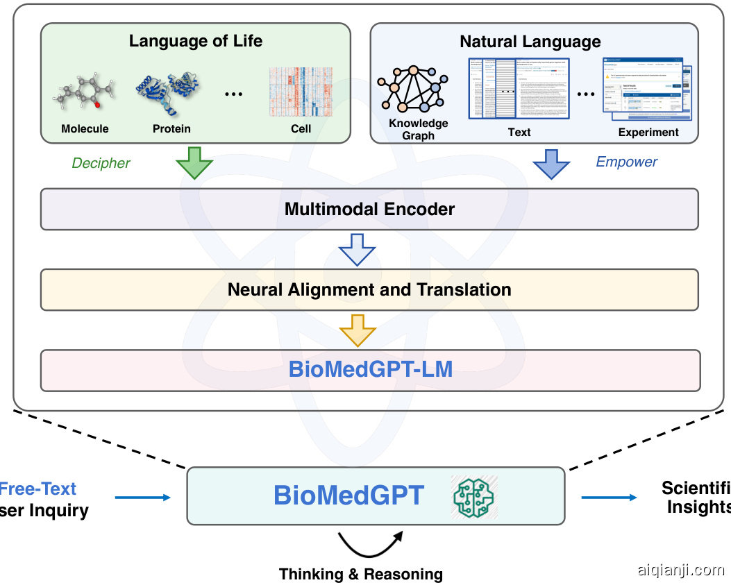 • 我们推出BioMedGPT,这是一个通过大规模生成式语言模型连接生命语言与人类自然语言的新颖框架。