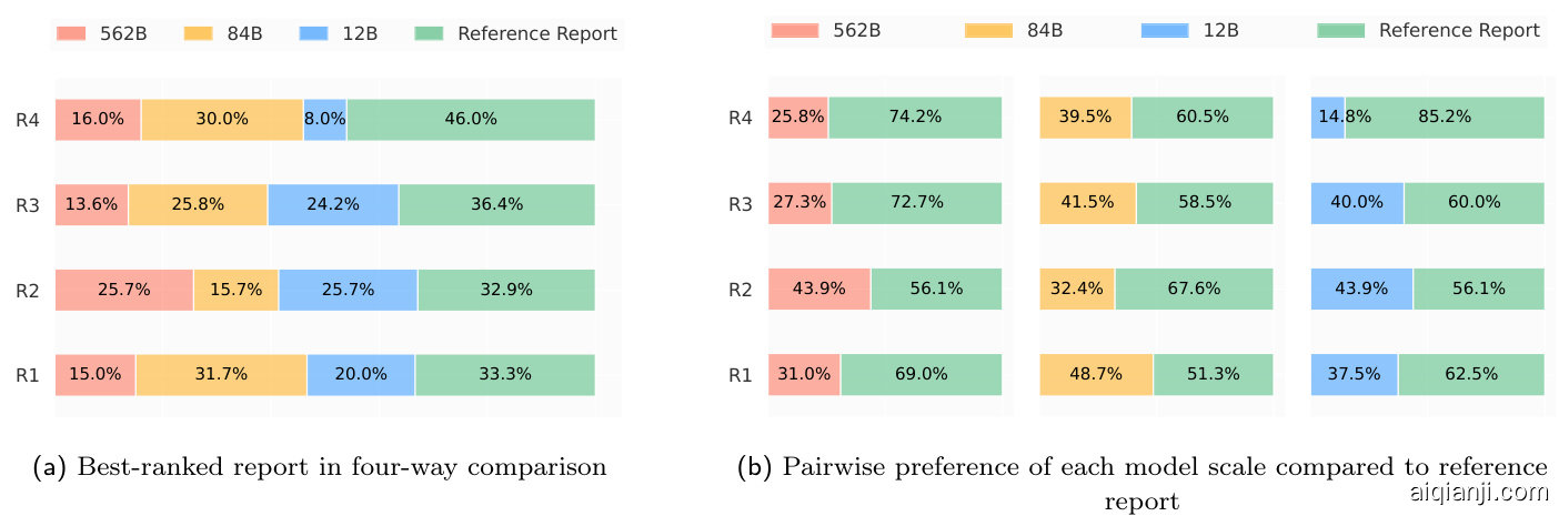 To enable a direct comparison of reports generated by each Med-PaLM M model scale to the radiologistprovided reference report, we derived pairwise preferences from the four-way ranking and provided a breakdown for each rater and model scale in Figure 4b. Averaged over all four raters, Med-PaLM M 84B was preferred over the reference report in $40.50%$ of cases, followed by the other two model scales, 12B and 562B, which were preferred over the reference report in $34.05%$ and $32.00%$ of cases, respectively.