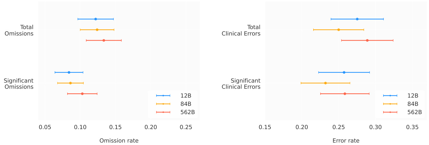 We report the rates of omissions and errors radiologists identified in findings paragraphs generated by MedPaLM M. Figure 5 provides breakdowns by model scales (12B, 84B, 562B). We observed different trends for omissions and errors. For omissions, we observed the lowest rate of 0.12 (95% CI, 0.10 - 0.15) omissions per report on average for both the Med-PaLM M 12B and 84B models, followed by 0.13 (95% CI, 0.11 - 0.16) for the 562B model.