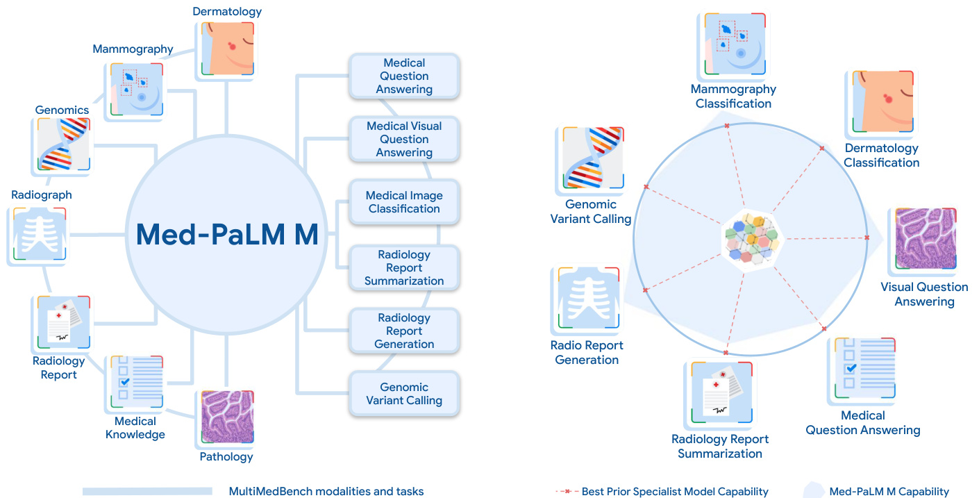 Figure 1 | Med-PaLM M overview. A generalist biomedical AI system should be able to handle a diverse range of biomedical data modalities and tasks. To enable progress towards this over arching goal, we curate Multi Med Bench, a benchmark spanning 14 diverse biomedical tasks including question answering, visual question answering, image classification, radiology report generation and sum mari z ation, and genomic variant calling. Med-PaLM Multimodal (Med-PaLM M), our proof of concept for such a generalist biomedical AI system (denoted by the shaded blue area) is competitive with or exceeds prior SOTA results from specialists models (denoted by dotted red lines) on all tasks in Multi Med Bench. Notably, Med-PaLM M achieves this using a single set of model weights, without any task-specific customization.