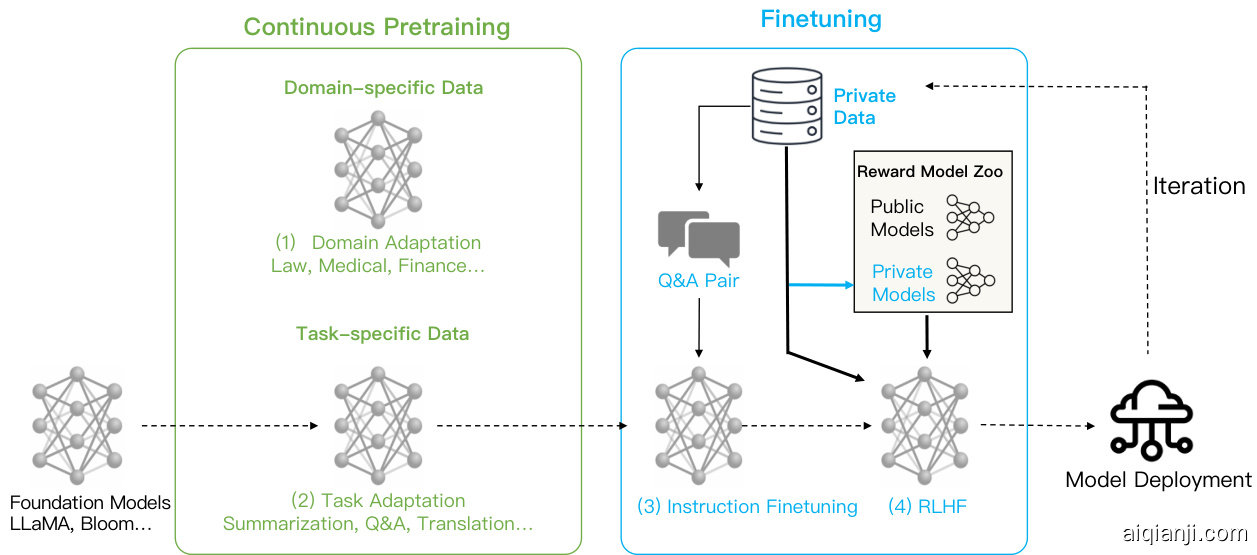 图 1: LMFlow的系统设计。从公开可用的基础模型开始,包含四个可能阶段:(1) 领域适配 (domain adaptation)、(2) 任务适配 (task adaptation)、(3) 指令微调 (instruction finetuning) 和 (4) 基于人类反馈的强化学习 (reinforcement learning with human feedback)。